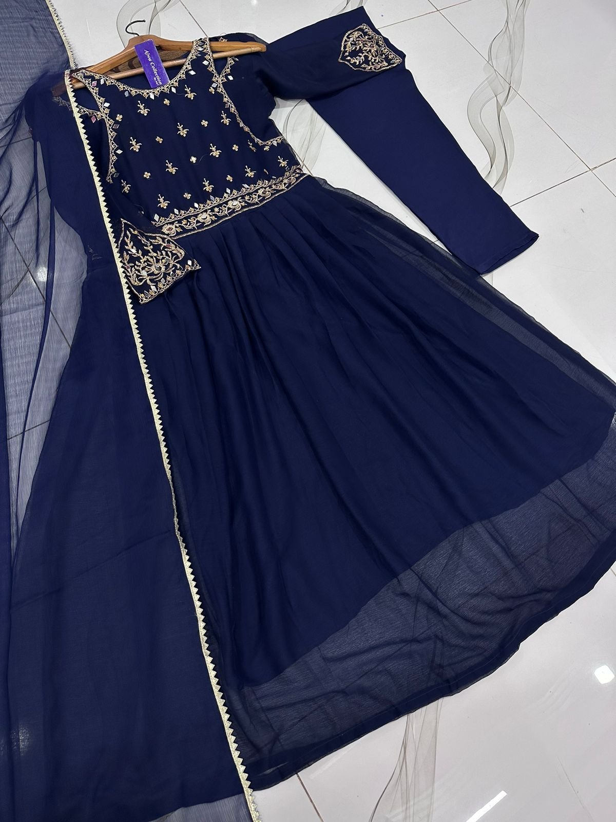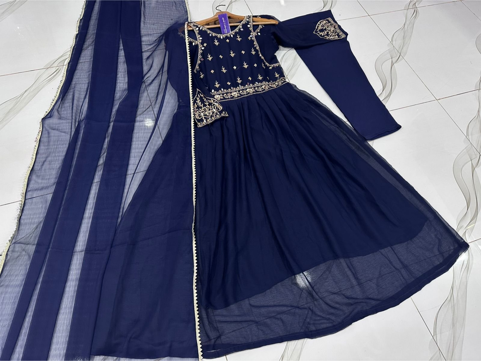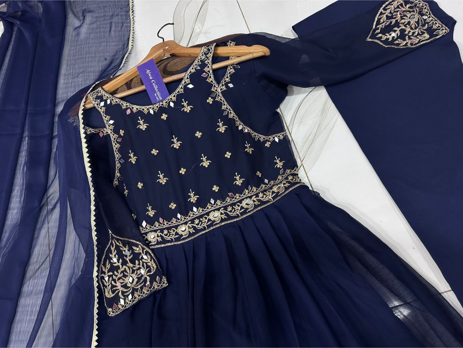 Work: Shoulder cutwork embroidery with mirrors & handwork stones