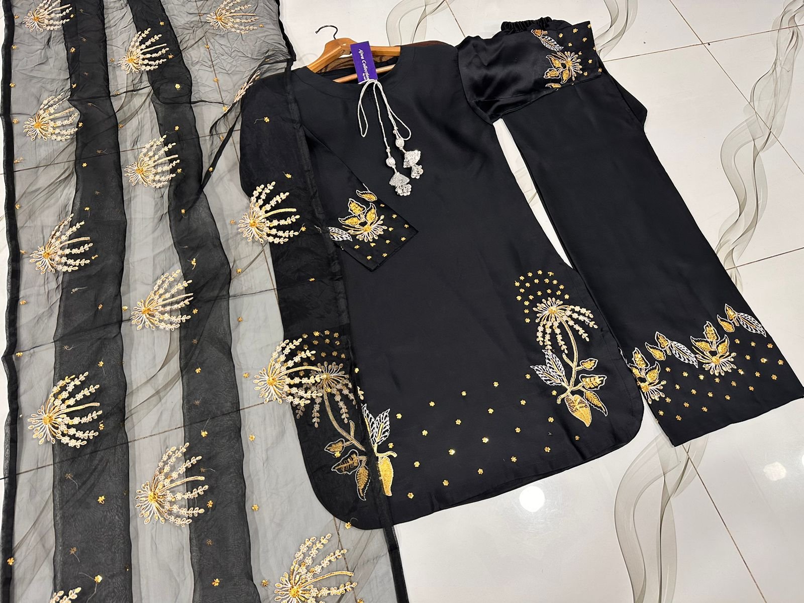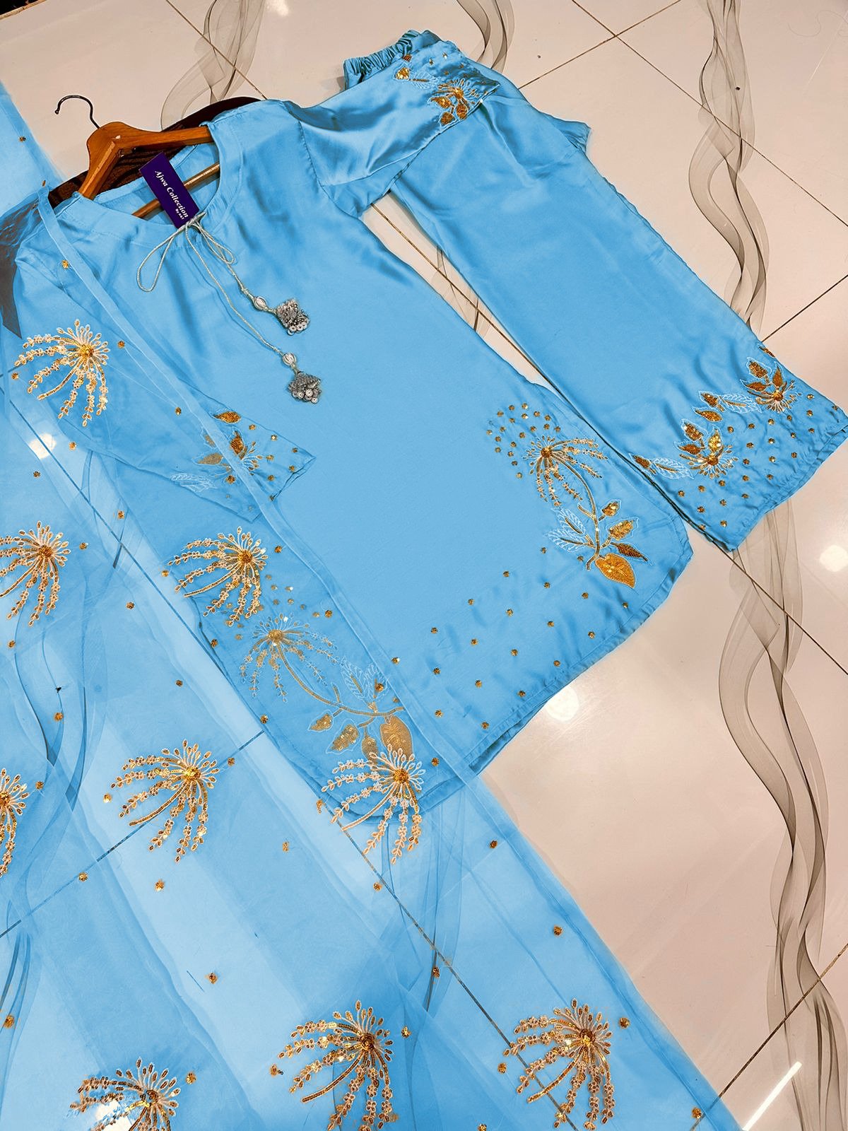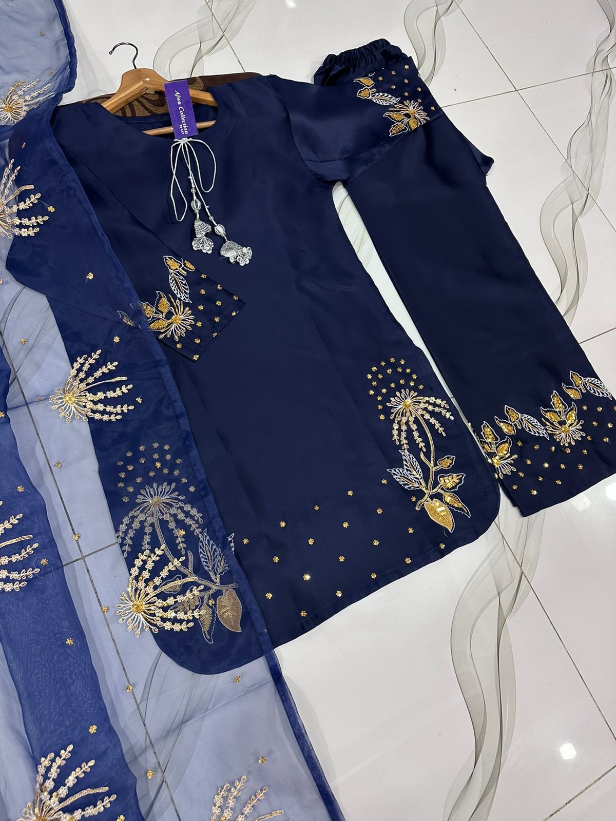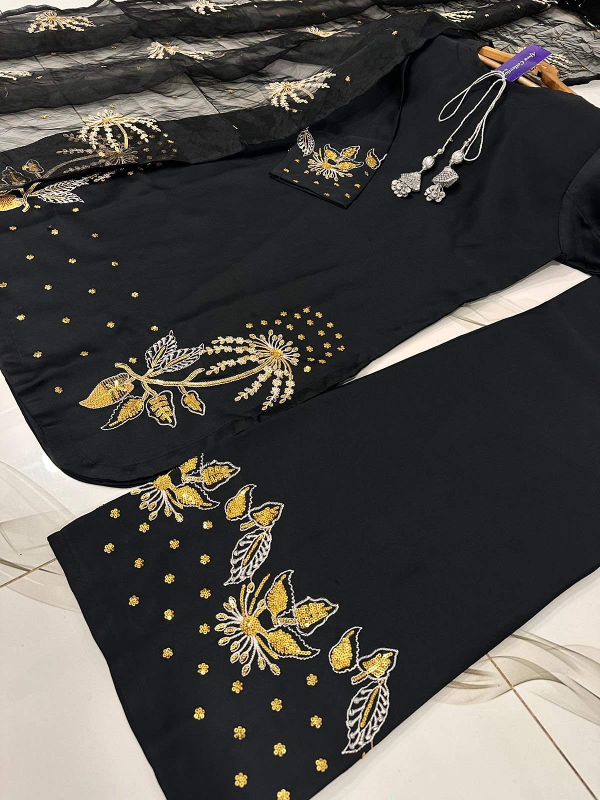 Work: Heavy silver & golden sequin embroidery on sleeves & border