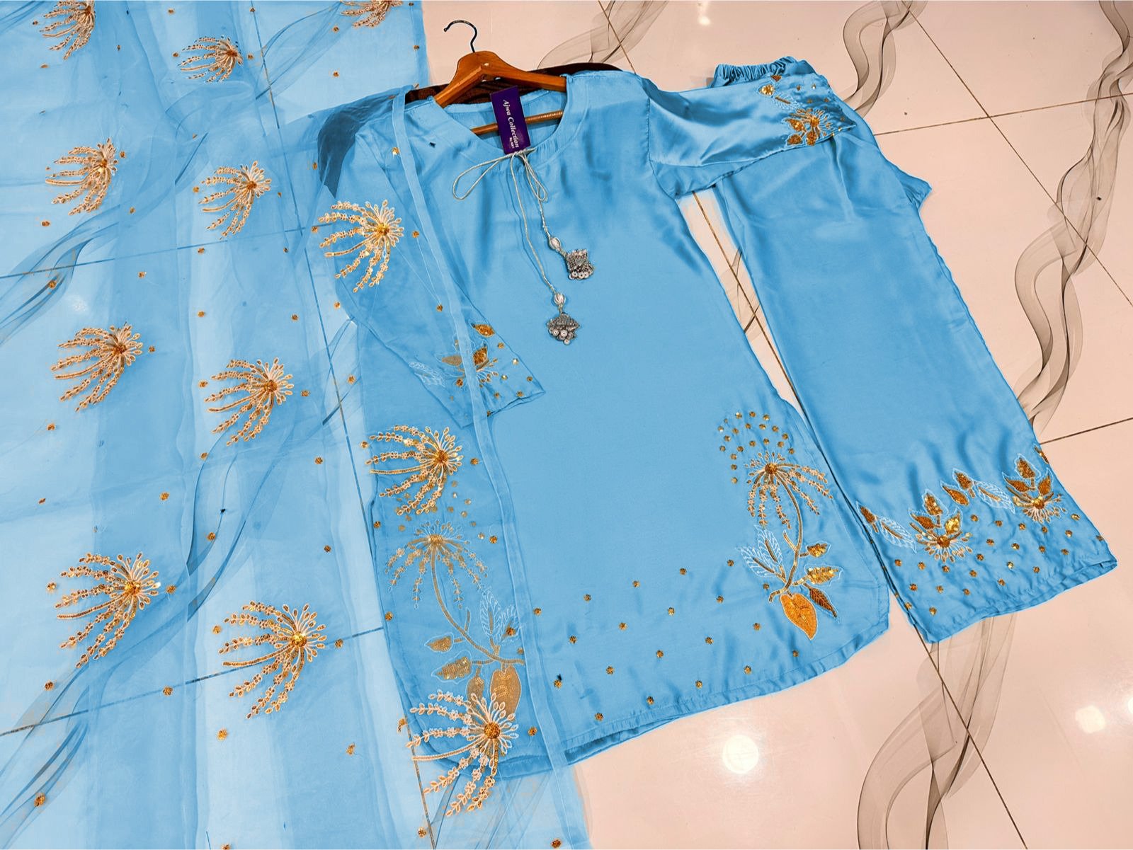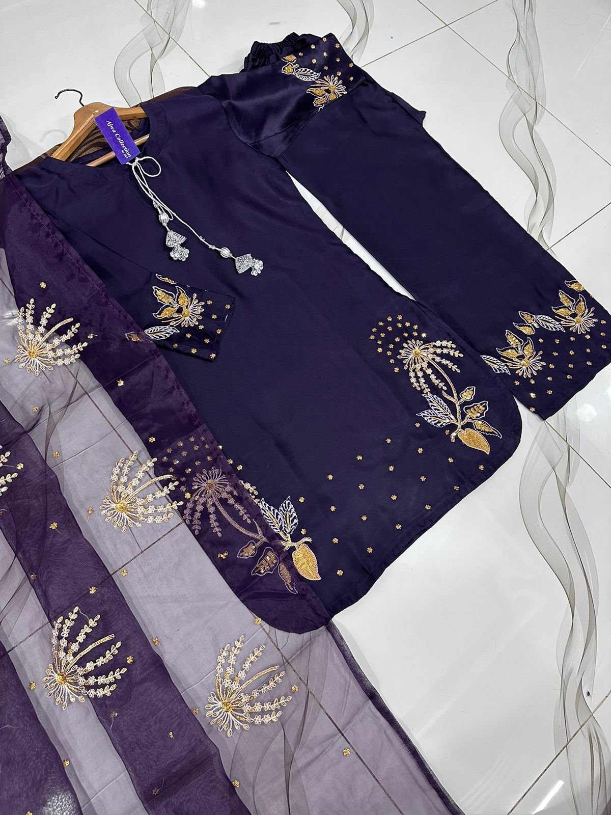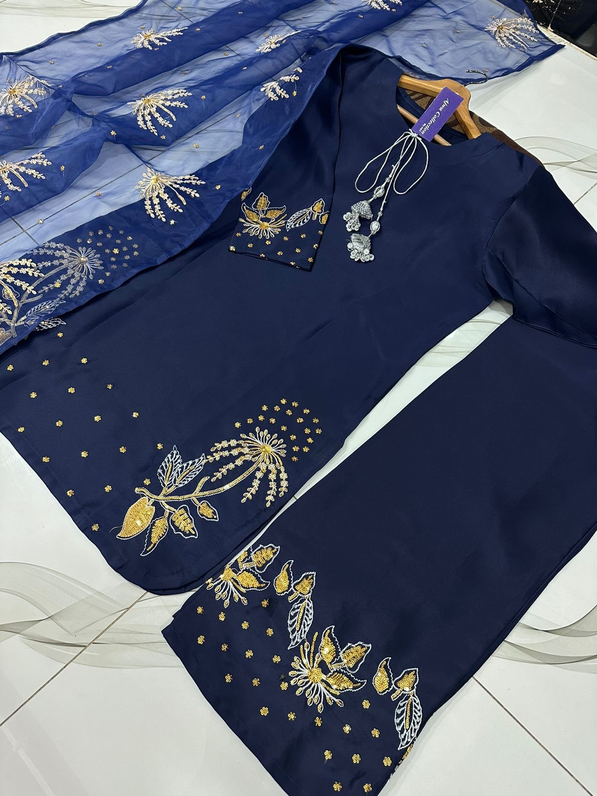 Work: Heavy silver & golden sequin embroidery.