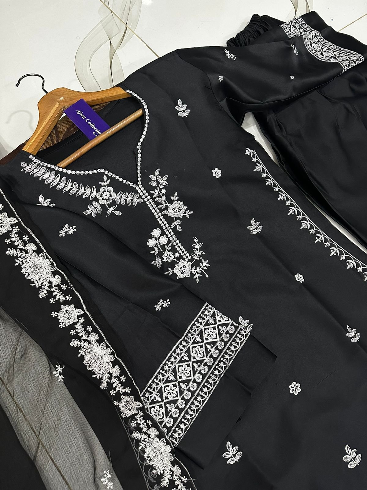 Graceful chiffon maxi featuring crystal handwork on the chest with heavy embroidered borders, paired with a fully embroidered dupatta—perfect for a classy and elegant look.