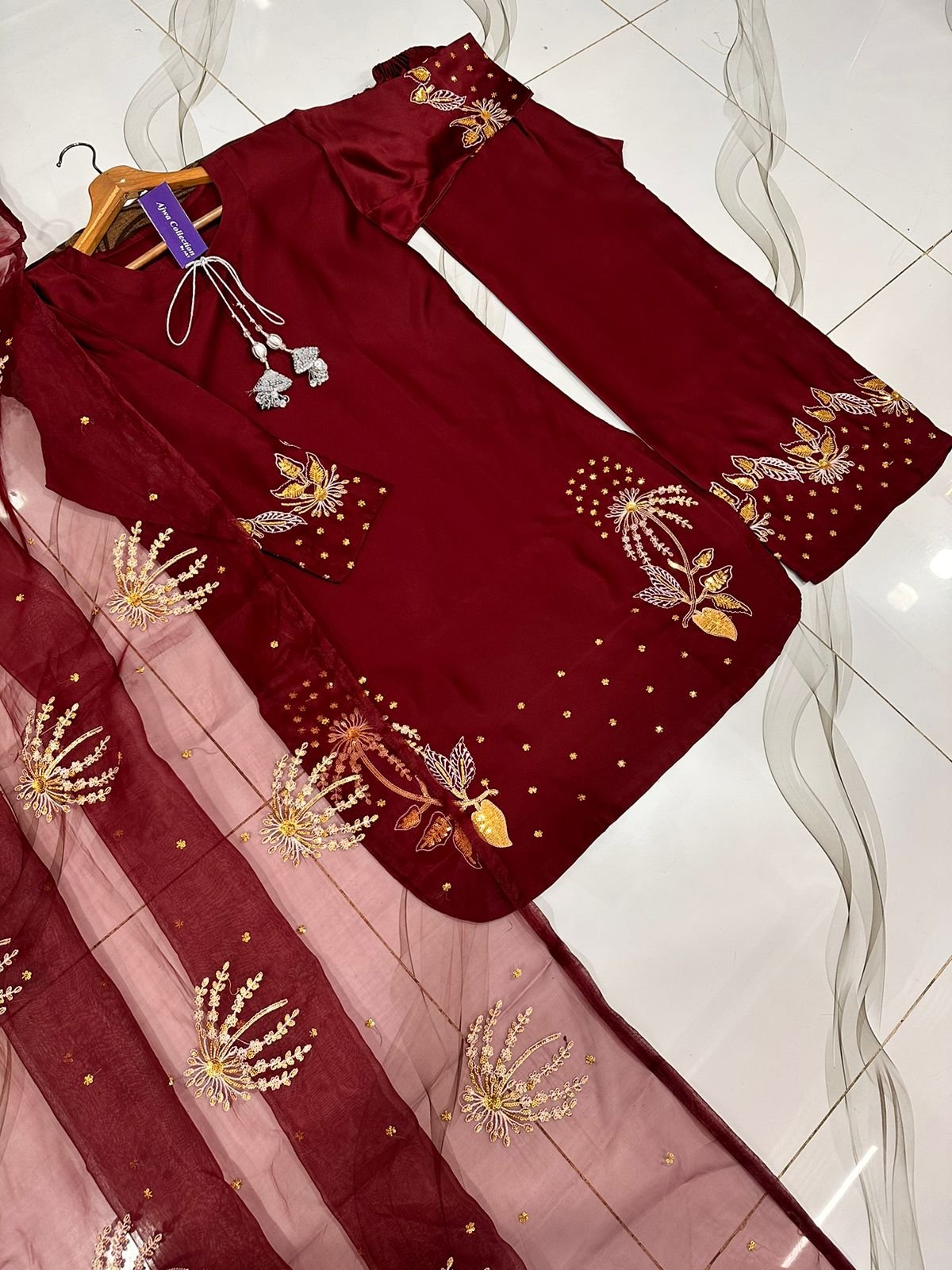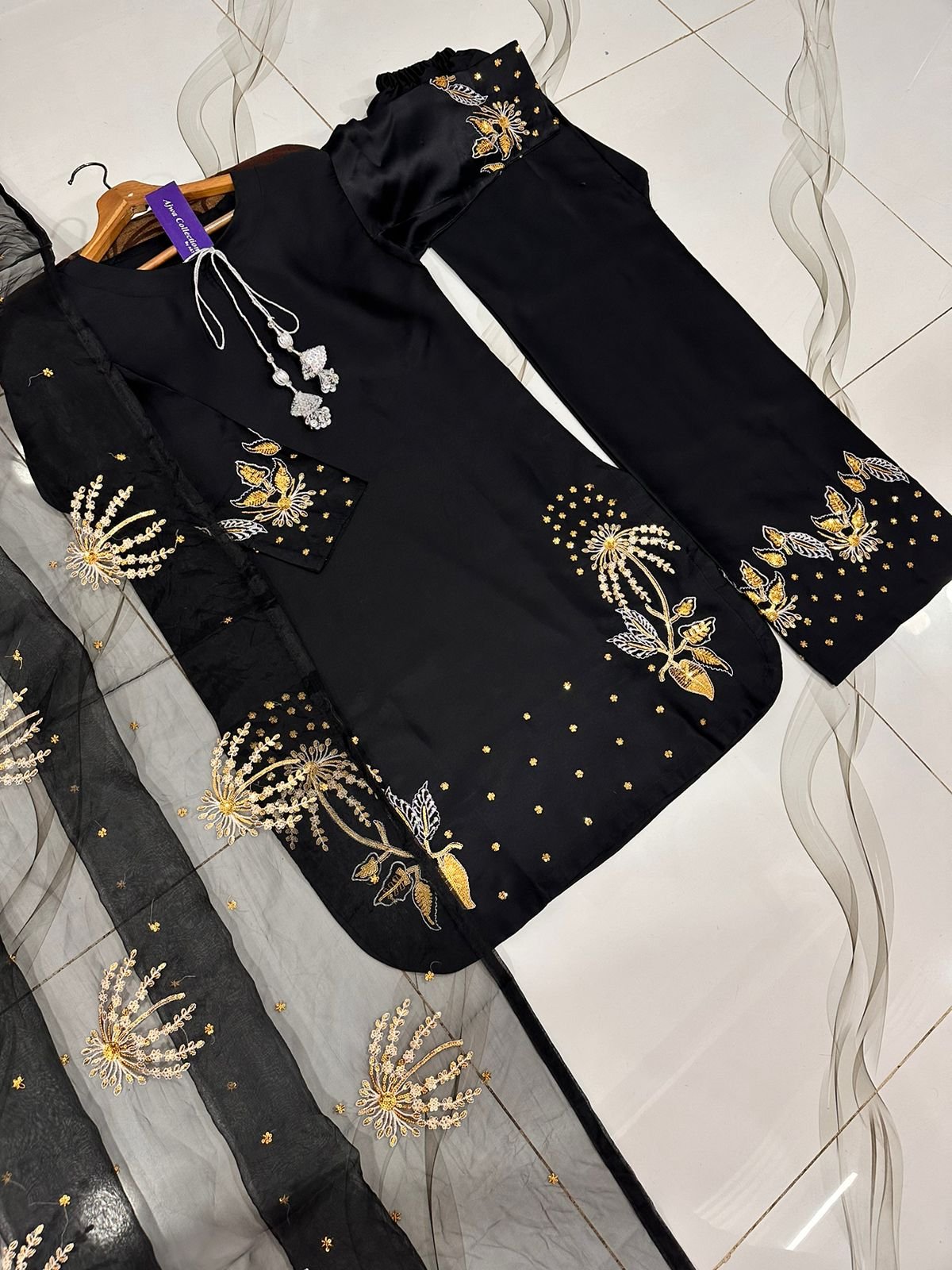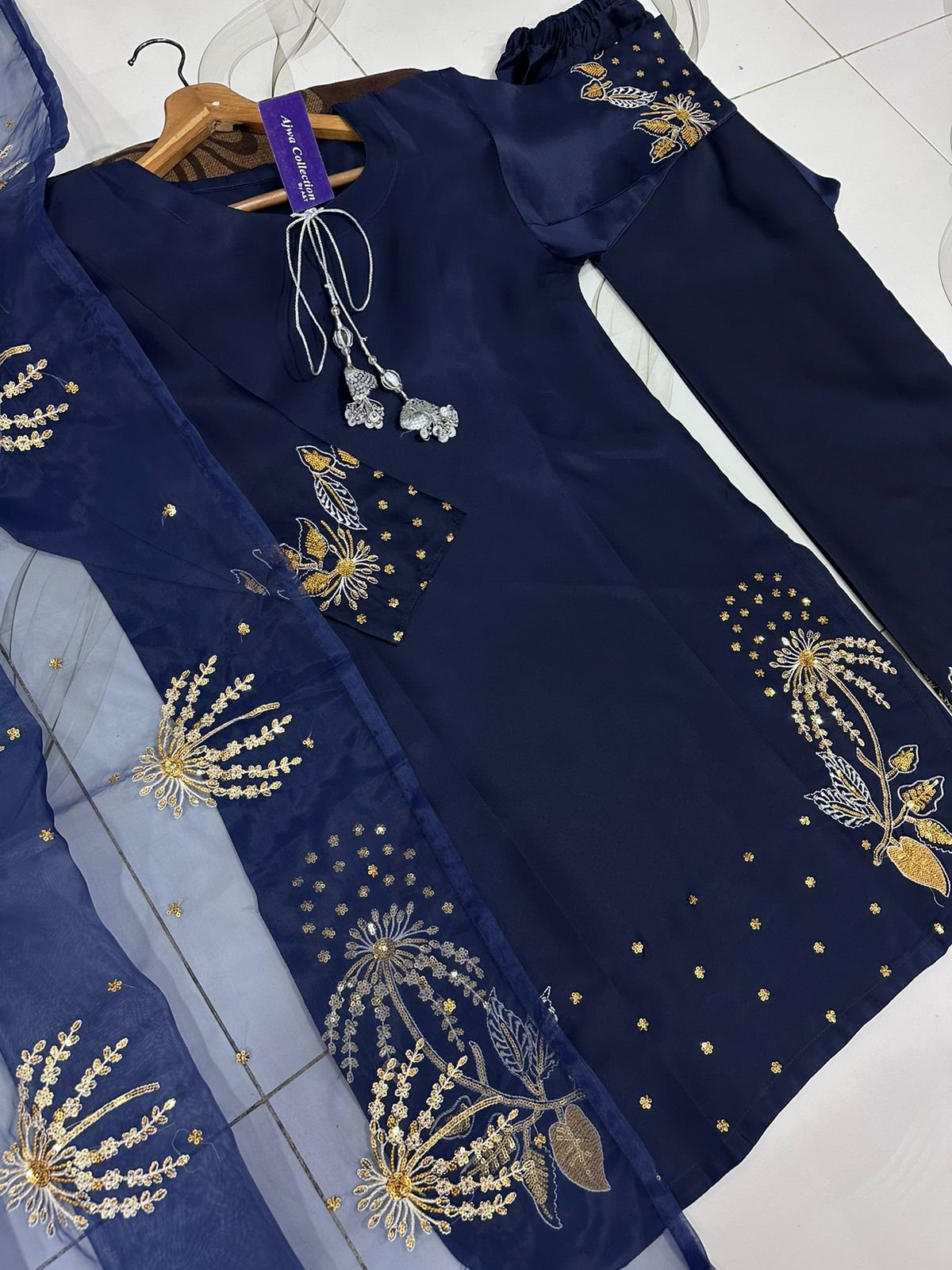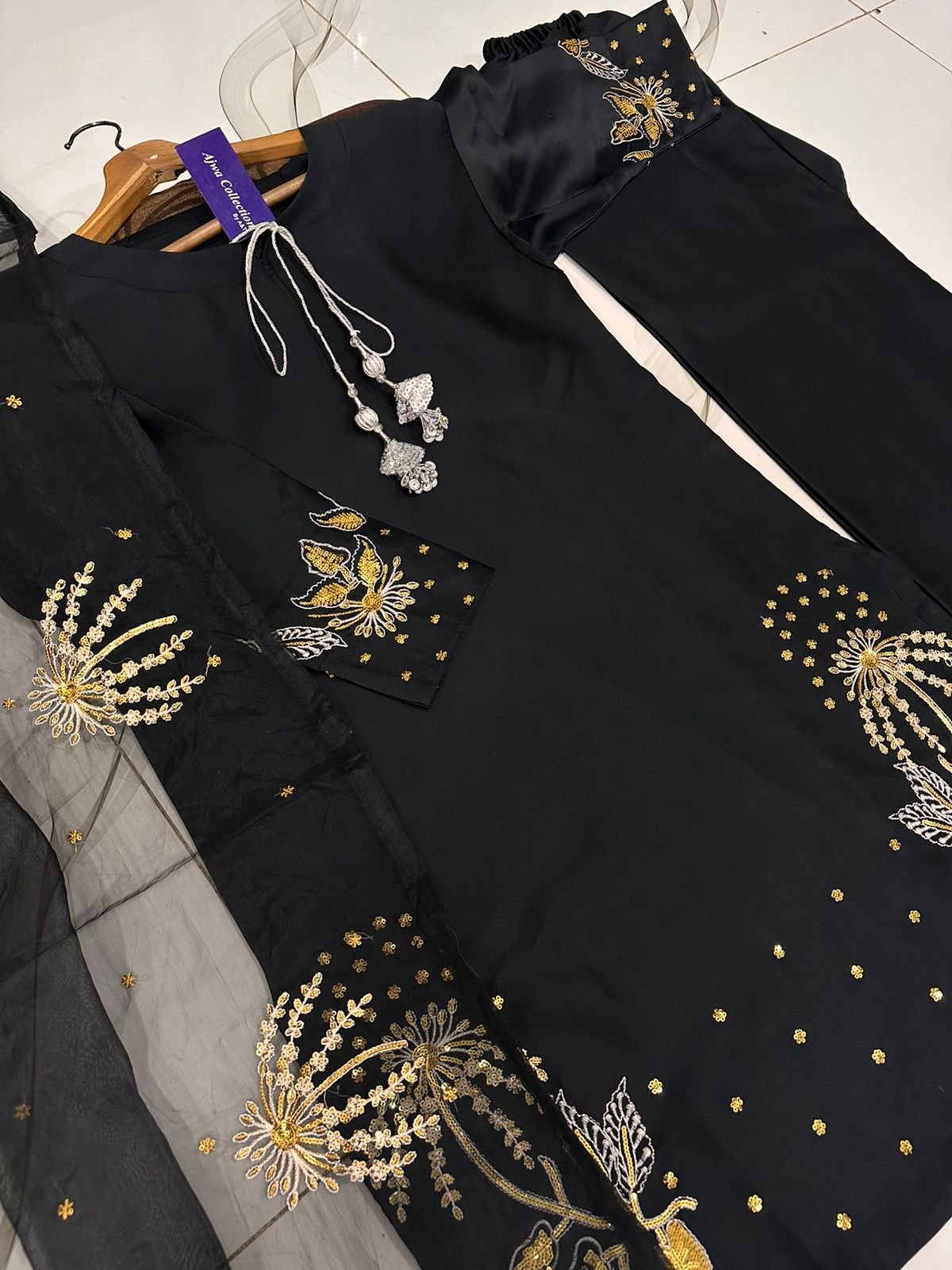 Work: Heavy silver & golden sequin embroidery on sleeves & border