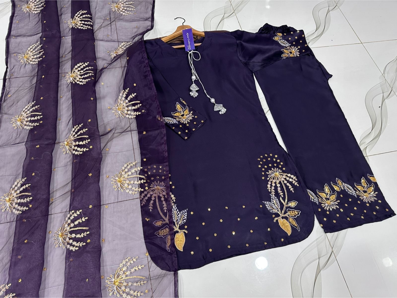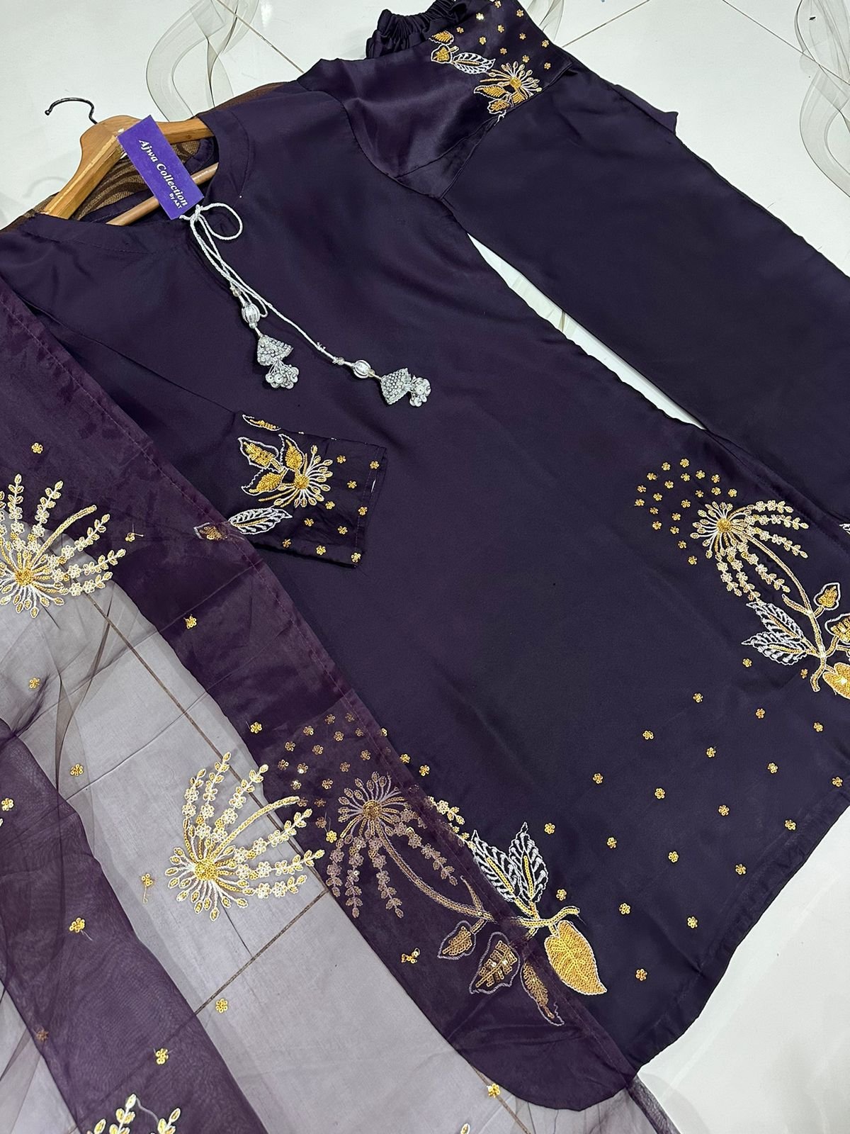 Work: Heavy silver & golden sequin embroidery.