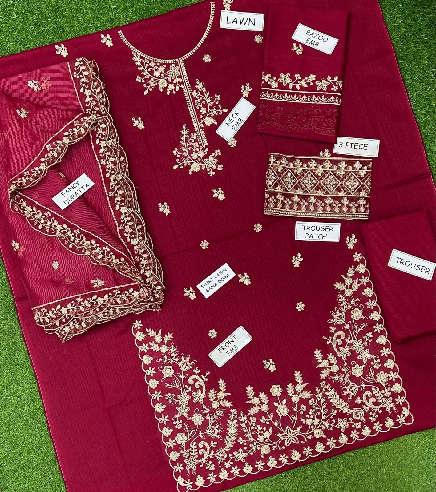 Premium Lawn fabric shirt with heavy embroidered neck, front, sleeves, and border giving a rich and elegant festive look.