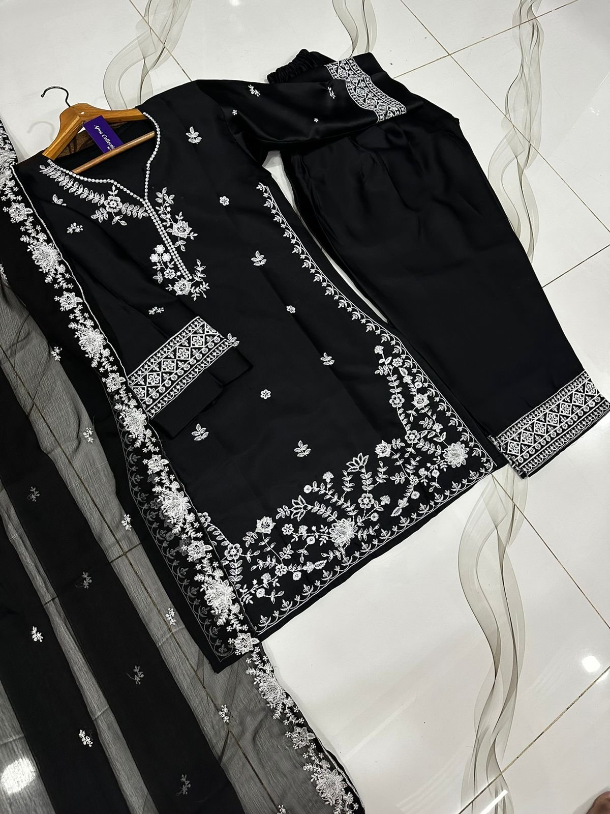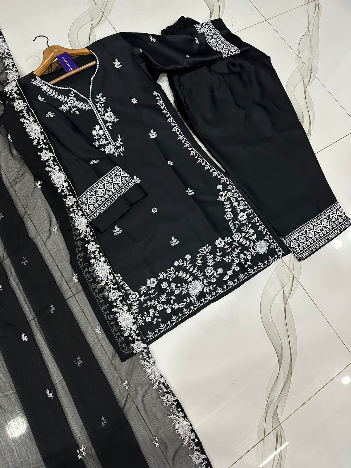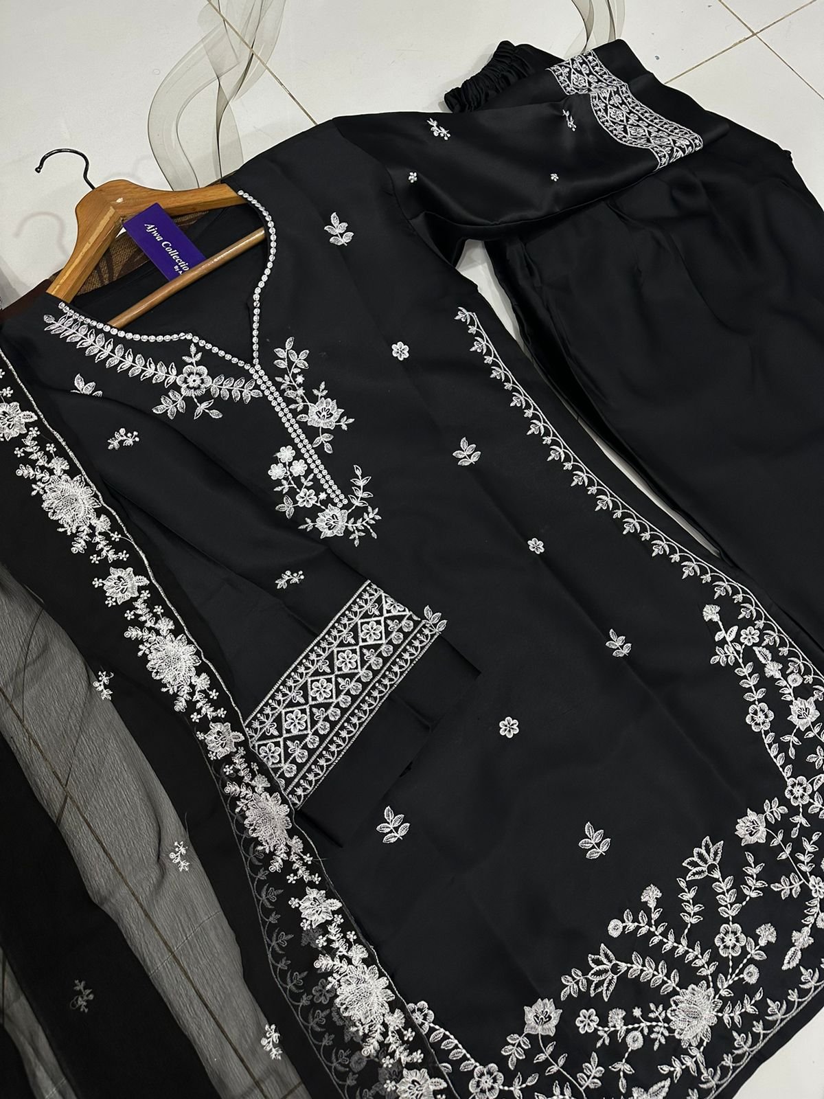 Graceful chiffon maxi featuring crystal handwork on the chest with heavy embroidered borders, paired with a fully embroidered dupatta—perfect for a classy and elegant look.