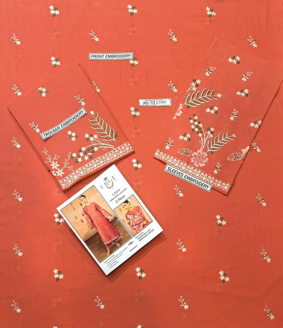 Premium quality 2PC lawn suit with heavy embroidery on front & sleeves, paired with a soft dyed trouser – perfect for an elegant summer look.